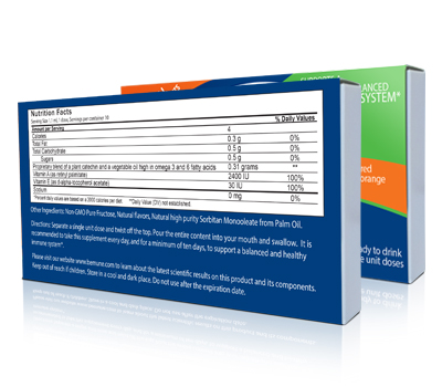 BMUNE is the result of years of scientific immunological research, which led to the discovery of the synergy between vitamins A, E and a Catechin enhancing the immune response. This patented formulation, which presents the active ingredients in droplet sizes of below 5 micrometers, enhances the uptake of its components by cells of the immune system. This results in activation of cellular anti-oxidant and immunomodulatory pathways, and a primed and balanced immune system*. A balanced immune system is the prerequisite for living healthy and avoiding many acute and chronic diseases.