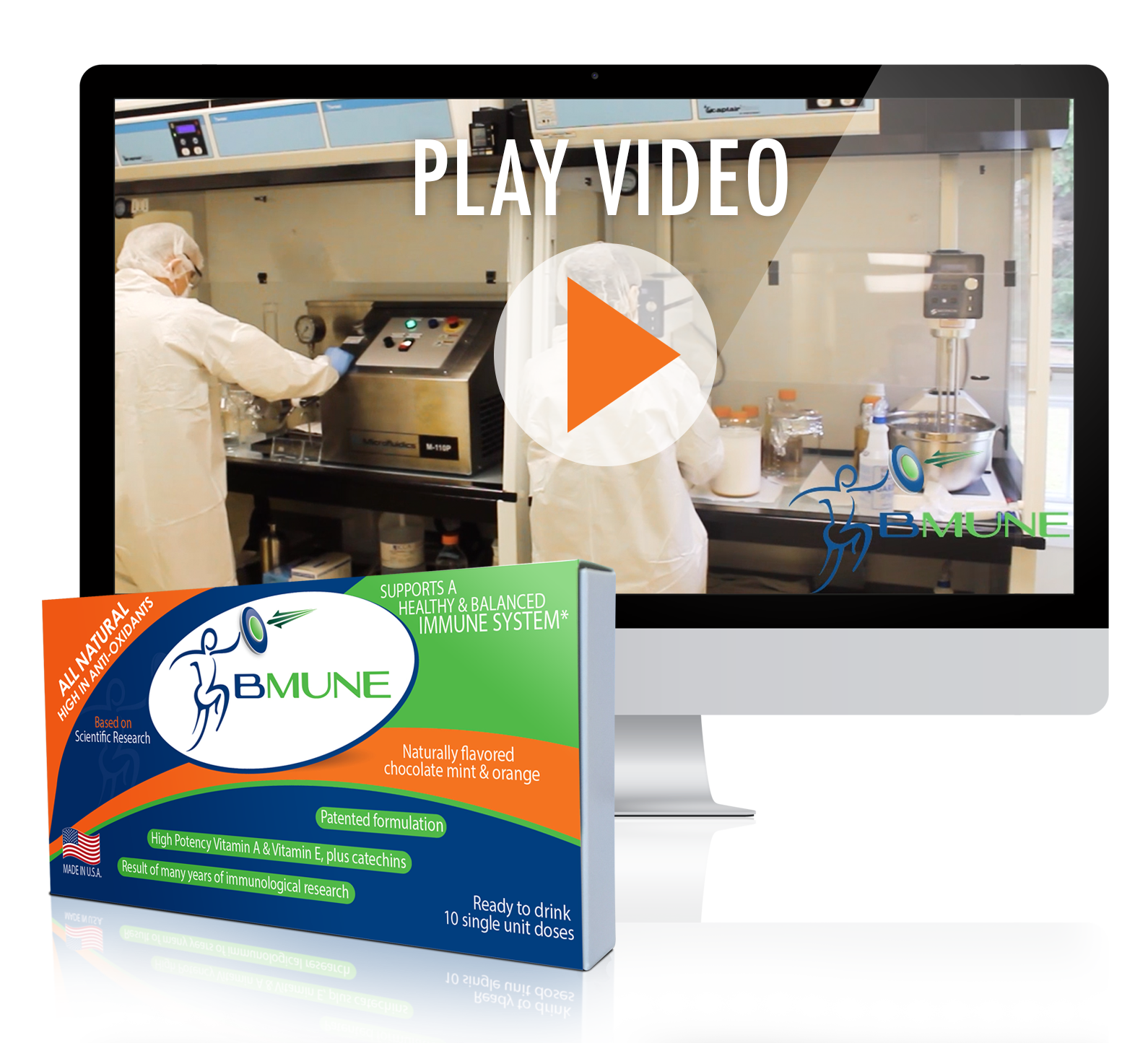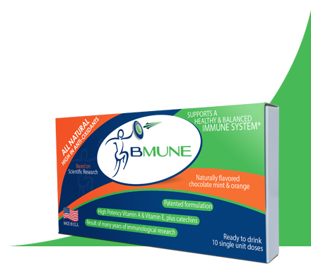 BMUNE is a science-based, all natural, liquid dietary supplement that is designed to maintain a healthy and balanced immune system*. The BMUNE formulation is patented (US patent Numbers 8,425,922 and 9,180,184) and is based on years of scientific research on the synergy between the active ingredients, i.e. the two vitamins, the Catechin, and a vegetable oil that is high in omega 3 and 6 fatty acids. This formulation is presented in the form of a ready to drink liquid with the amazing taste of natural chocolate-mint & orange. This powerful combination of antioxidants and immuno-modulators is designed to be taken up by cells to readily exert their effect*. BMUNE is made in USA of the highest quality all-natural raw materials and under strict adherence to FDA manufacturing guidelines.